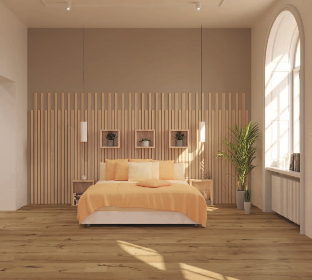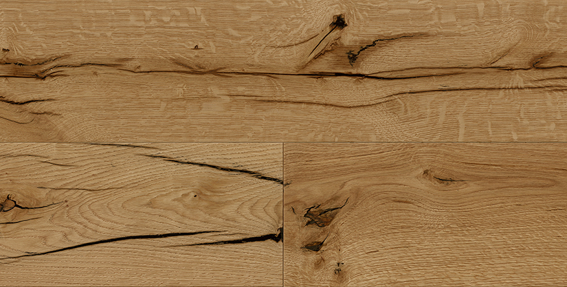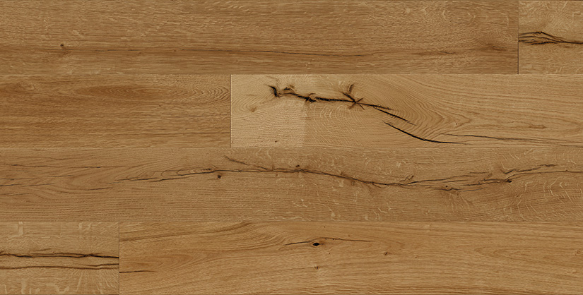 Naturgeölte Eiche vereint sich mit einem sanften Zusammenspiel aus Beige- und Brauntönen. Durch die sorgfältige Bearbeitung treten markante Astansätze und feine Risse hervor, die dem Boden seinen unverwechselbaren Charakter geben. Jede Planke wirkt einzigartig – als würde sie ihre ganz eigene Geschichte erzählen.